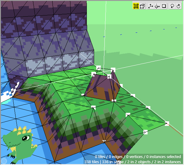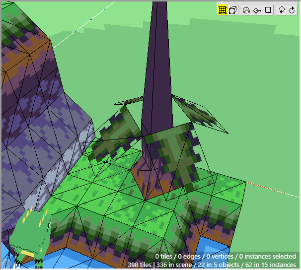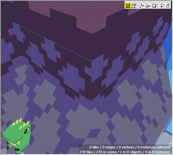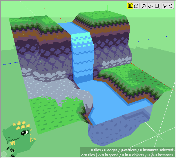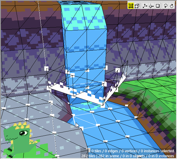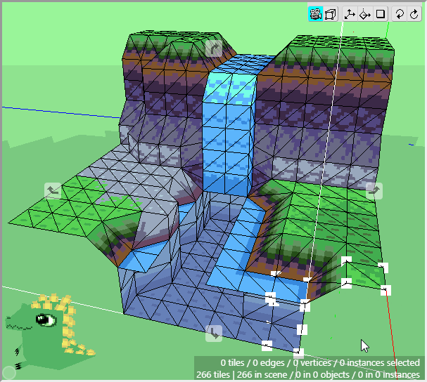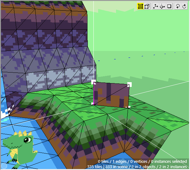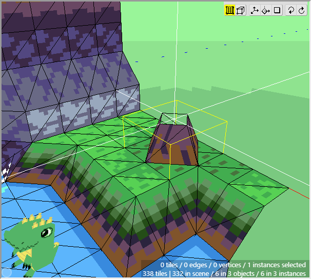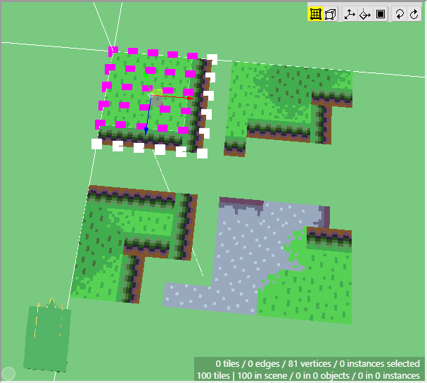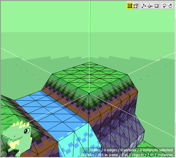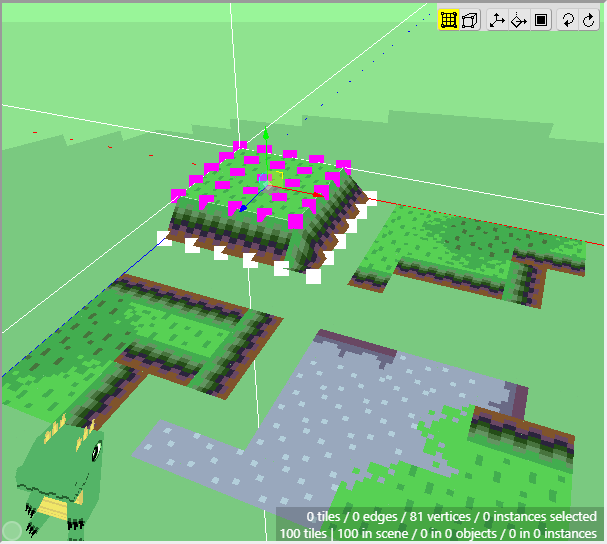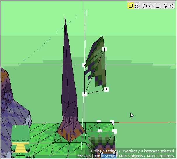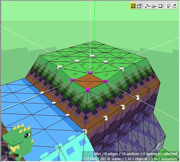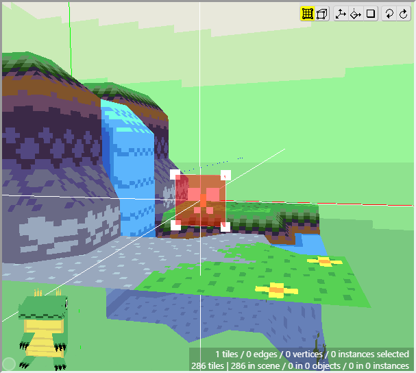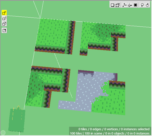 Once we have some tiles drawn into the scene, we can begin editing their shape. We want to angle downwards the tiles that will connect to the cliff walls, as well as the tiles that will connect to the water. First switch to Edit Mode.
