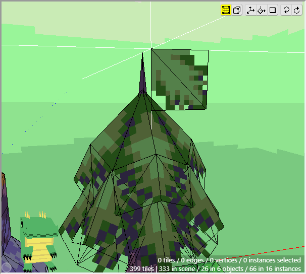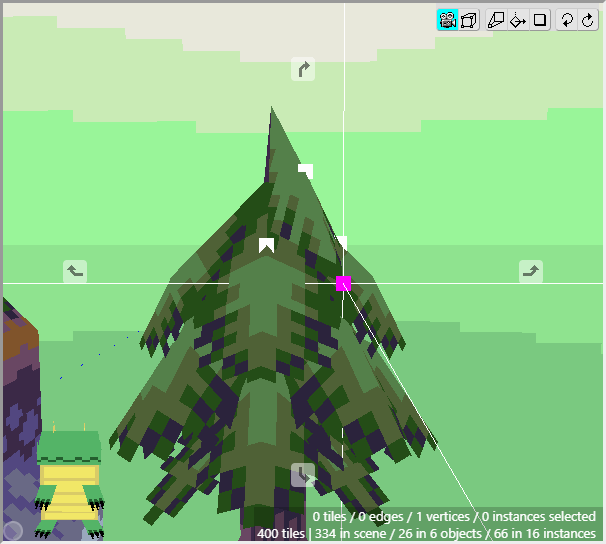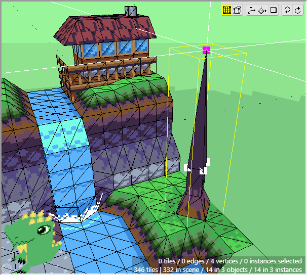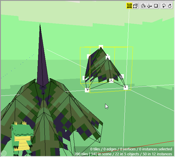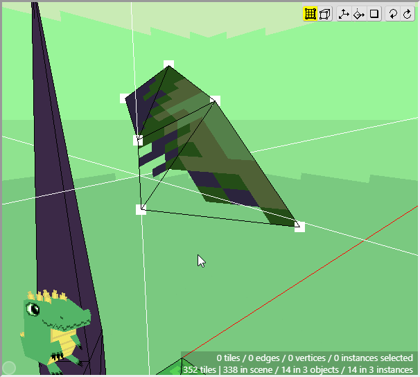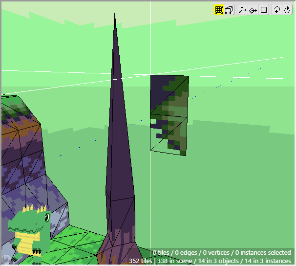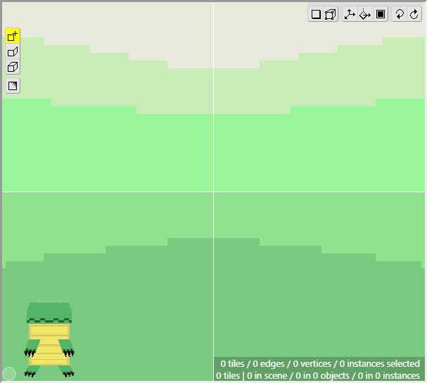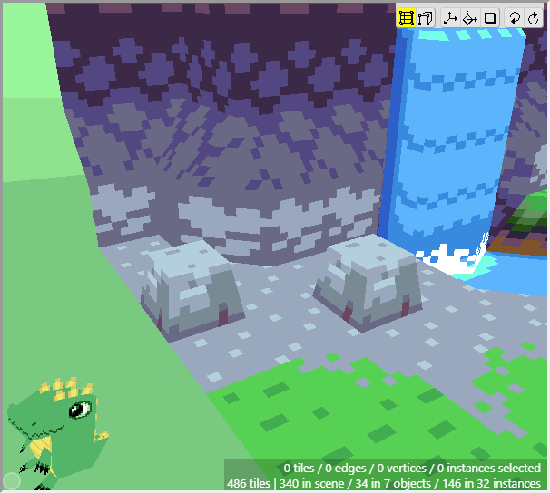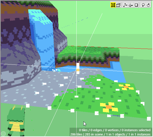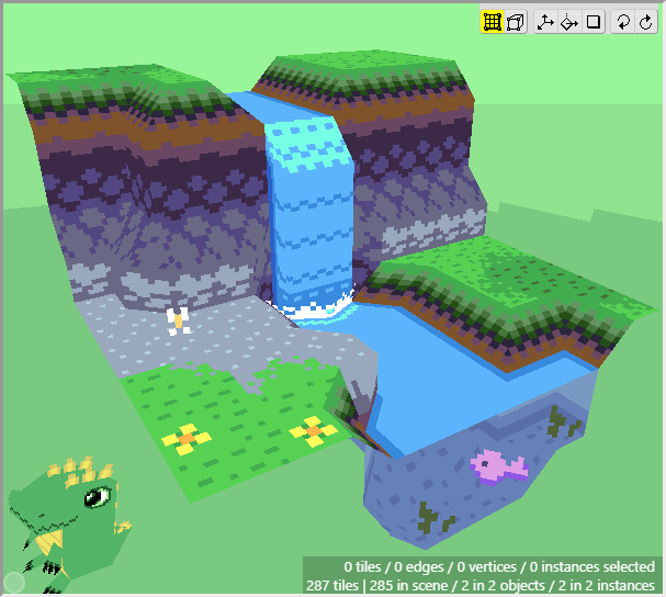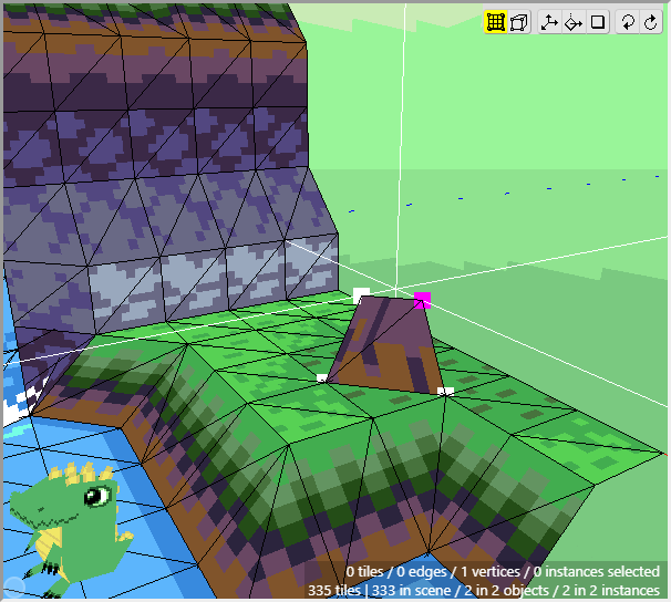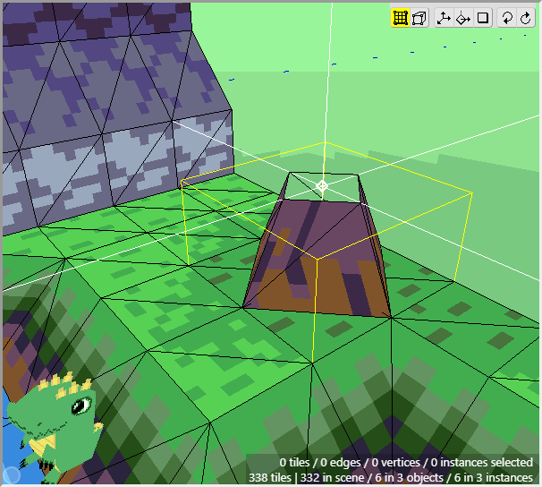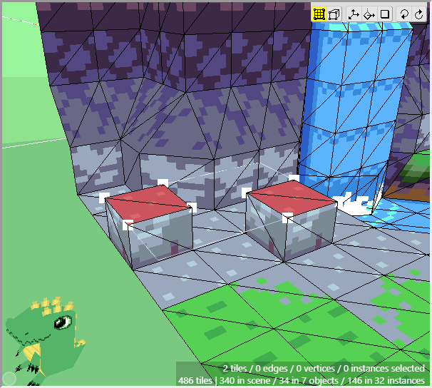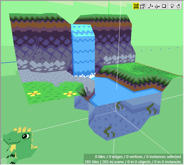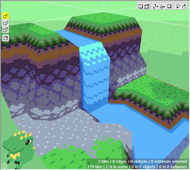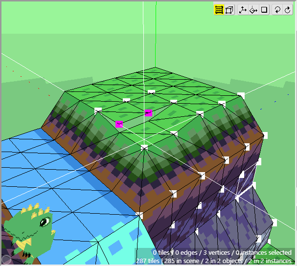 Once we have some tiles drawn into the scene, we can begin editing their shape. We want to angle downwards the tiles that will connect to the cliff walls, as well as the tiles that will connect to the water. First switch to Edit Mode.