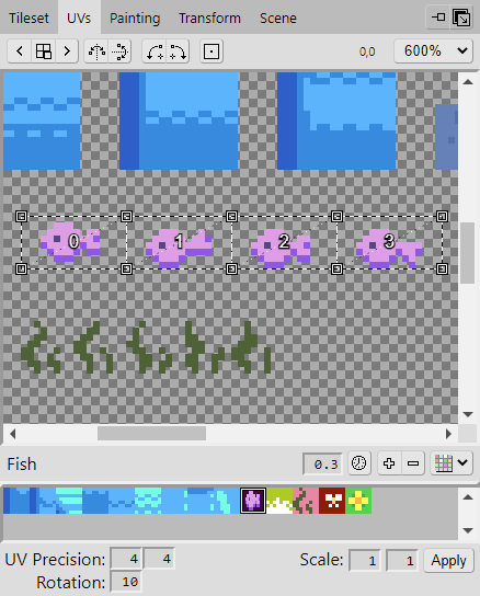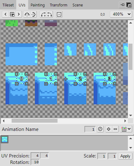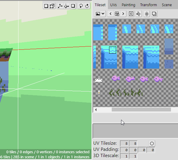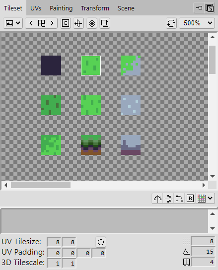 Now change the UV Tilesize to have a width and height of 8 pixels. The tiles we create will be 8 pixels in dimension, and setting the UV Tilesize will ensure that when we select from the tileset, it will select using that measurement.