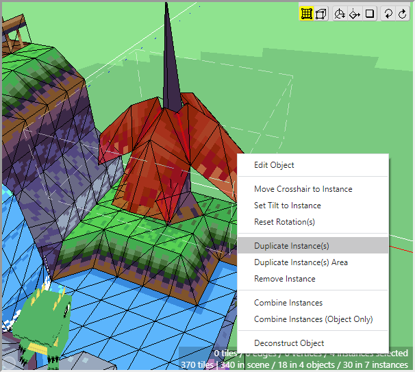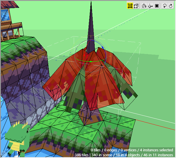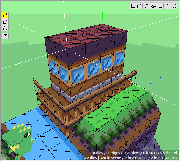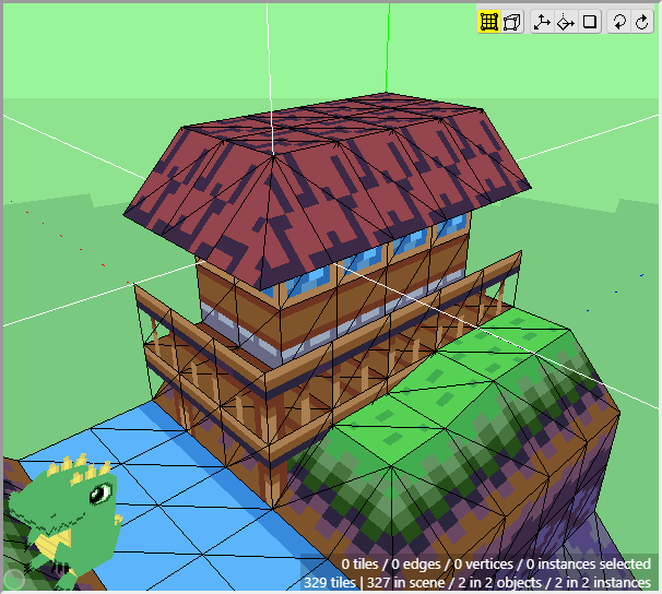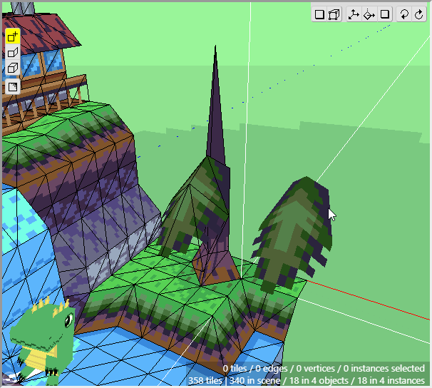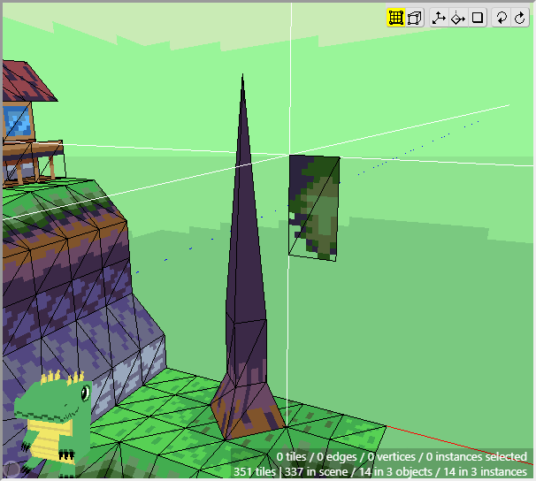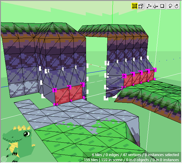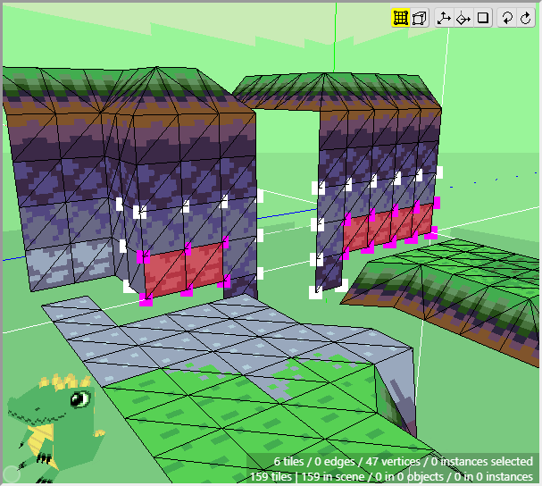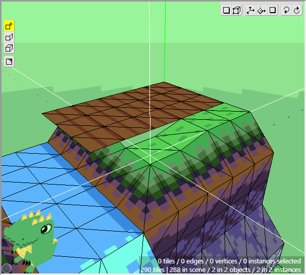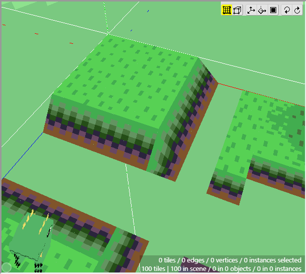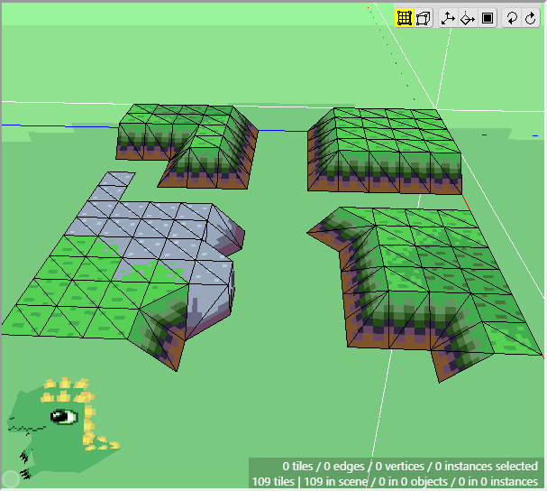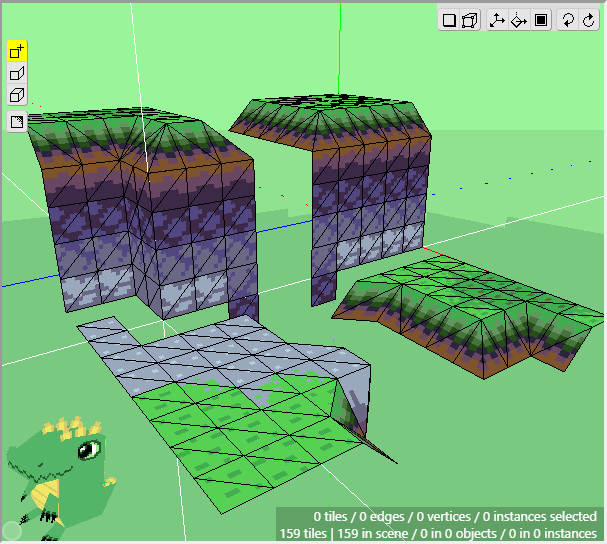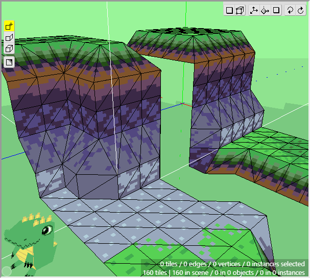 The ground is basically complete for now. Notice how we can achieve a nice variety of shapes and textures using just a few tiles from a tileset and constructing them in 3d. Now we can move onto the cliff tiles in the next section. Don't forget to save your project! Crocotile will save a backup every 5 minutes in the folder where Crocotile resides, but it is good practice to keep backups of your own.