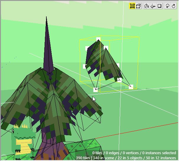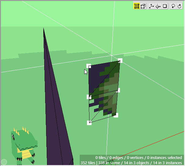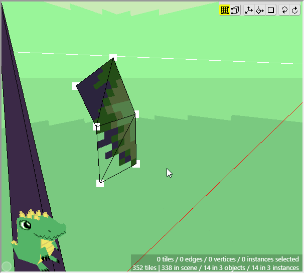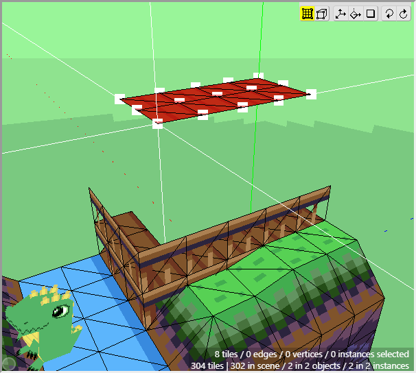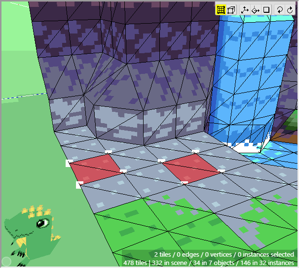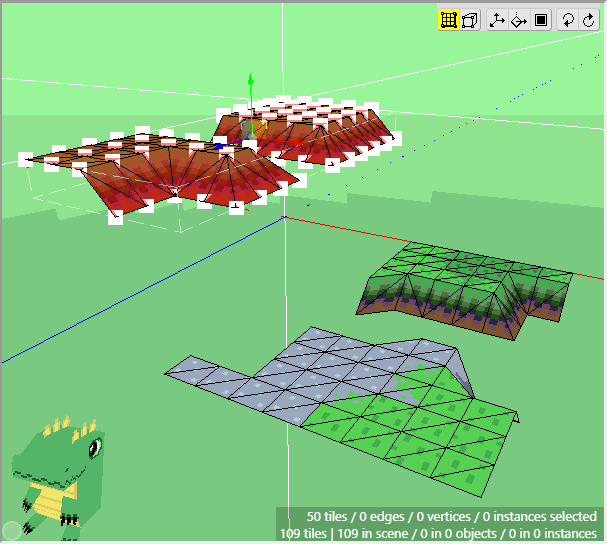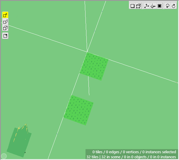 Now make sure that Edit Mode is activated and select the two patches of grass in the 3d scene that will be used at the top of the cliff. You can hold Shift and click and drag the mouse to select the faces of multiple tiles, instead of the vertices. You can also hold Shift+Alt and click and drag to deselect the faces of multiple tiles.