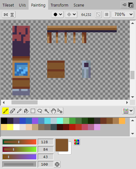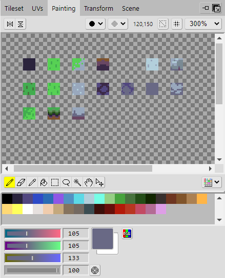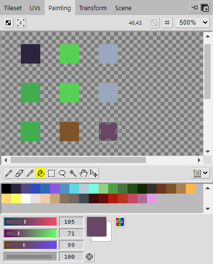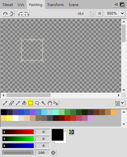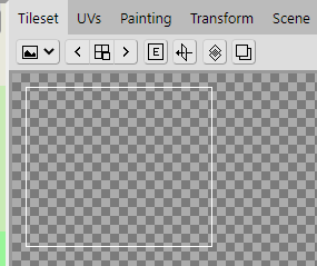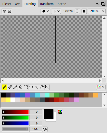 With the area selected in the Tileset, click the Painting tab to open the Painting panel where you will find various tools you can use to edit the tileset image. Here you will draw the tiles onto the tileset.