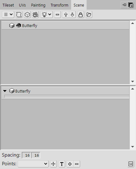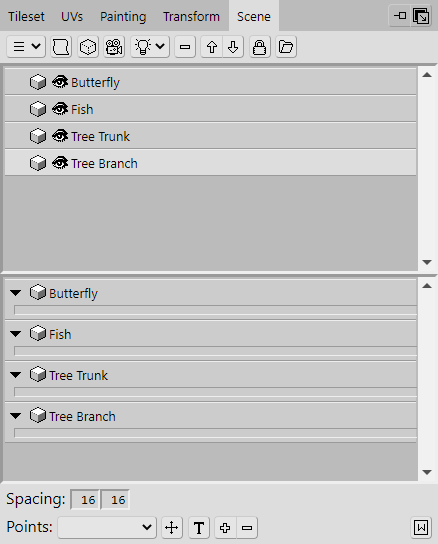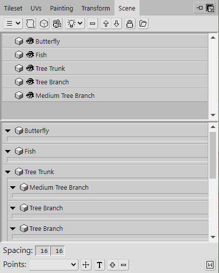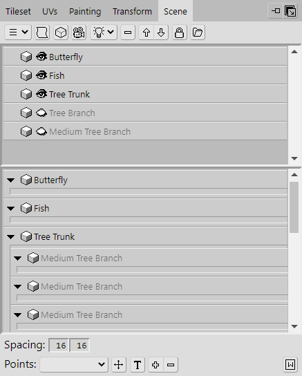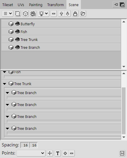 Before we move on to the top of the tree, let's add some simple branches underneath these instances. To make it easier to add them, click the eye icons located on the listed Objects in the Scene panel. This will hide the instances so that they aren't in the way. Their names will also become greyed out to indicate that they are hidden.