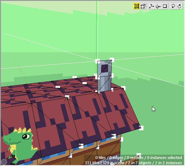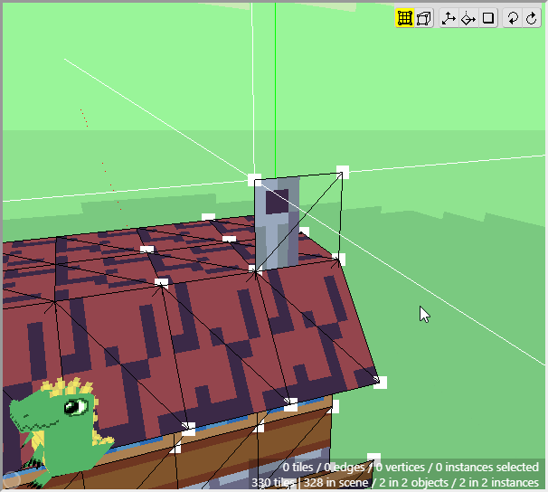 With Edit mode enabled, you can select the vertices, edges, and faces of tiles. Select the vertices shown in the image. You can simply click on the vertices (the white squares), or you can click and drag a marquee box around the vertices to select multiple. To deselect them, you can click them again, or hold Alt and click and drag a marquee box to deselect multiple vertices. You can also deselect every vertex by pressing Ctrl+D.