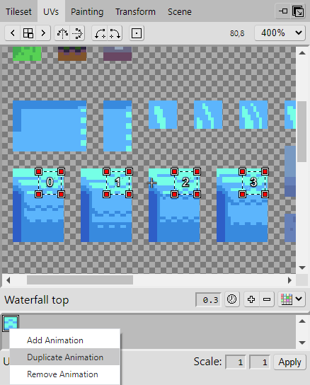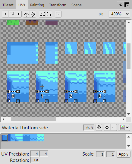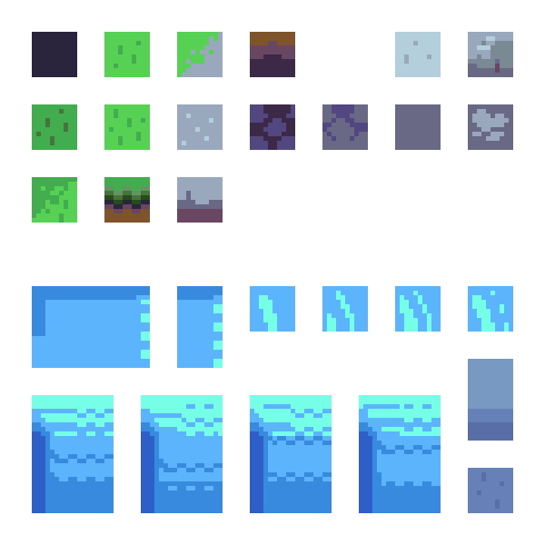 At the moment, the waterfall just appears static and unmoving. In order to animate it, there must be multiple frames to cycle through that will give the illusion that the water is flowing. Take a look at the example image and use the previous steps you have learnt to add these new tiles to the tileset. It should be noted that there is a one-pixel sized padding around the tiles and groups of tiles to avoid any pixel bleeding.