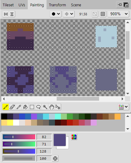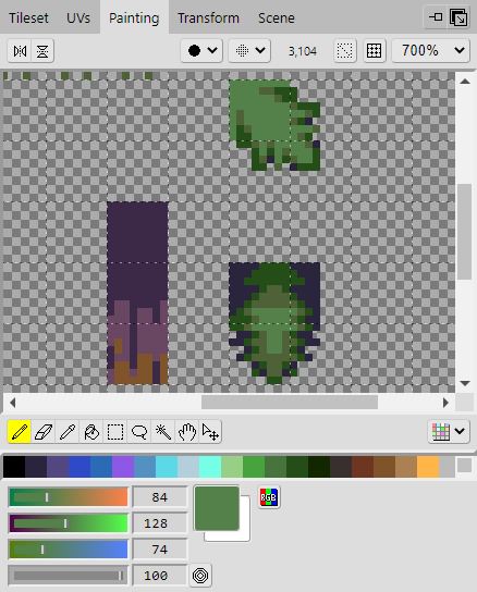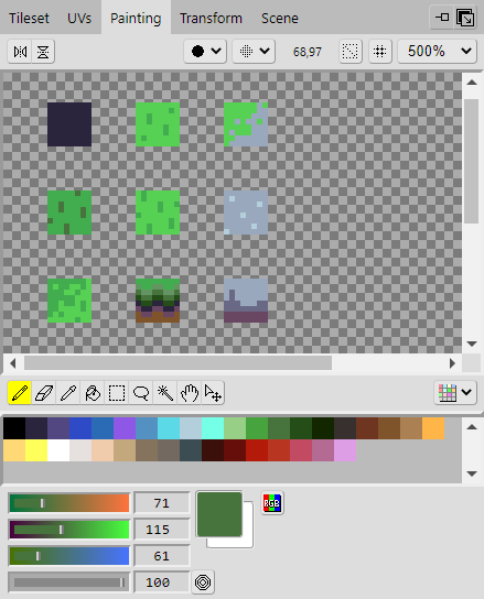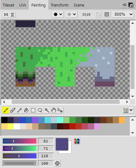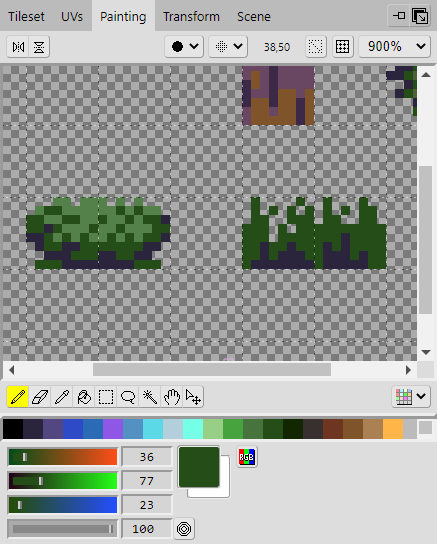 Repeat the same steps as before. In the Tileset panel, select the area on the tileset that you want to edit, then go to the Painting panel and paint the tiles onto the tileset. Once you've added all of them, you should end up with something that looks like the example.