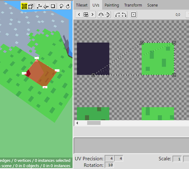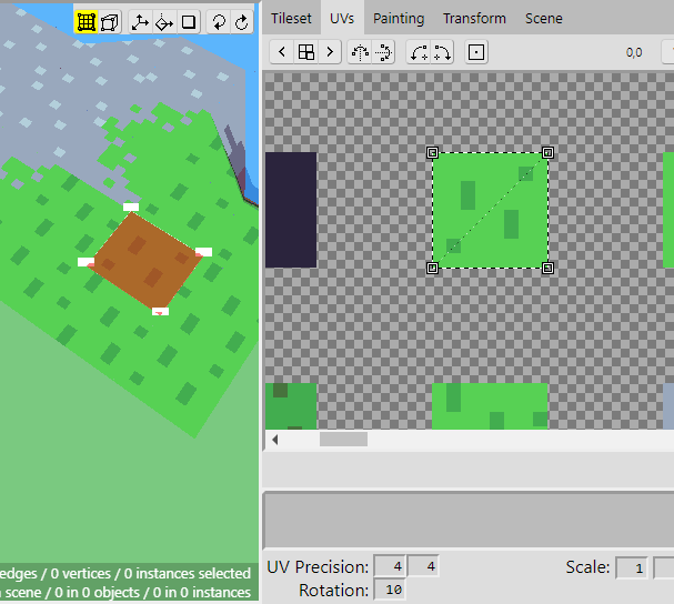 Select the face of the bottom right tile and open the UVs panel. Find the UV coordinates in the tileset and adjust the coordinates so that they look like this.